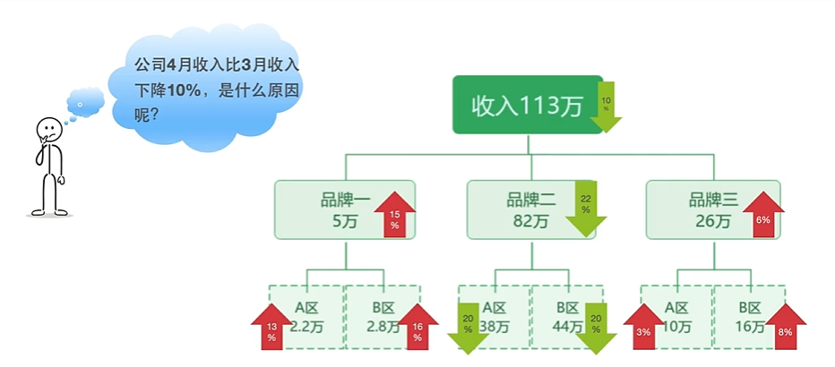 什么是结构分解法: 结构分解法采用金字塔形结构, 可使业务结构的层次更分明、条理更清晰, 简单明了的表达了各业务结构之间的关系. 可采用逻辑树方式进行对比分析, 它是将问题按项目组成结构进分层罗列, 从最高层开始, 逐步向下扩展, 如剥洋葱、剥笋一样, 层层深入, 分析项目构成的变化, 直至找到问题所在.