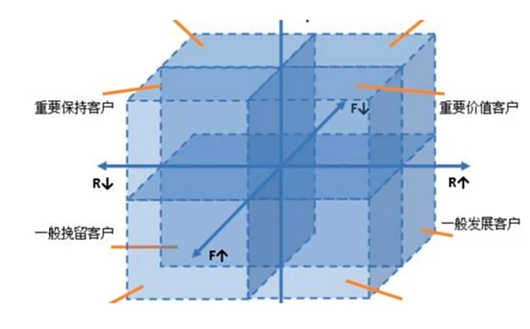 RFM分析方法在会员价值分析中经常用到, 把客户按最近一次消费时间(Recency)、消费频率(Frequency)、消费金额(Monetary) 三个维度分成八个等级, 判断客户价值.